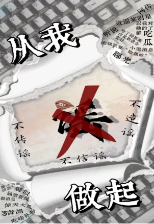 《键盘之上,真相至上》该作品以键盘为背景,象征网络发言与信息传播,周边文字代表通过网络传播的谣言,中间采用撕纸效果,寓意谣言被打破、真相浮出水面。海报整体旨在传达“不造谣、不信谣、不传谣”的网络文明理念,呼吁大家明辨网络信息,让谣言止于智者,共同营造风清气正、公平有序的网络环境。