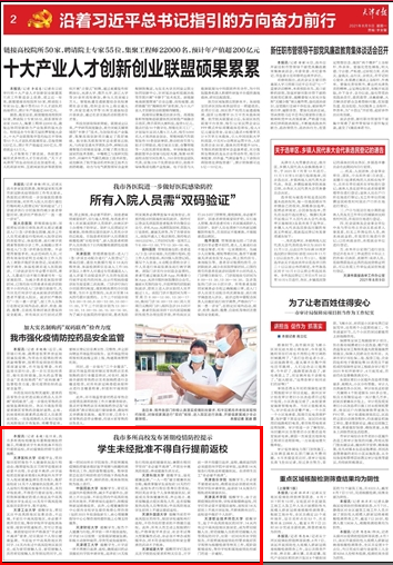 《天津日报》报道我校发布暑期疫情防控提示,学生未经批准不得自行提前返校