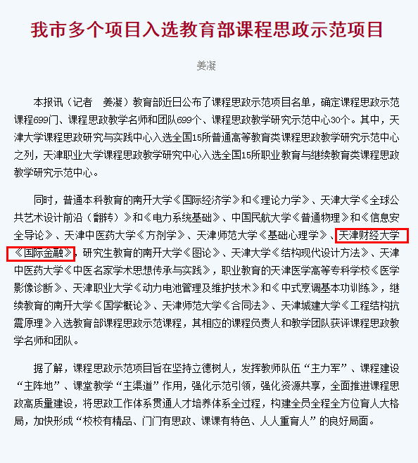 《天津日报》报道我校《国际金融》入选教育部课程思政示范项目