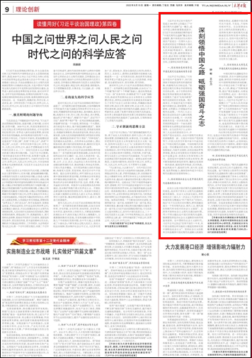 习近平总书记在中国共产党成立100周年之际提出了“中国式现代化道路”这一概念,成为中国之路的重要组成部分。《习近平谈治国理政》第四卷对“中国式现代化道路”概念的生动阐释,集中体现在《在庆祝中国共产党成立一百周年大会上的讲话》《坚定不移推进中国式现代化》《加强政党合作,共谋人民幸福》等篇章中。要深刻领悟中国之路、砥砺强国奋斗之志,就必须深入把握中国式现代化道路的领导力量、根本方向、主要特征和世界贡献。