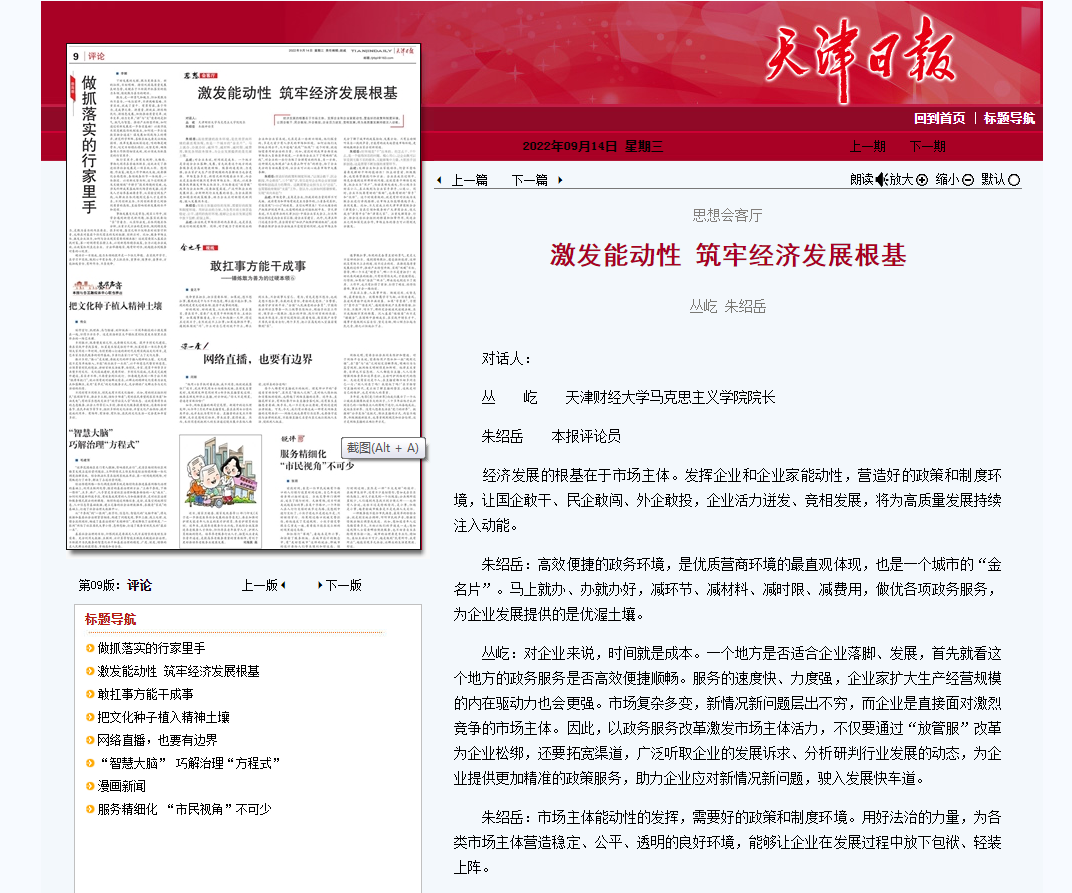 《天津日报》刊登丛屹院长专访:激发能动性 筑牢经济发展根基