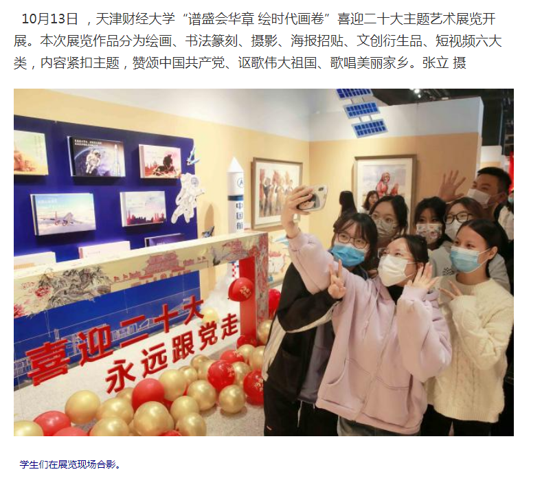 10月13日,我校“谱盛世华章·绘时代画卷”为主题的喜迎二十大主题艺术展开幕。津云、《天津教育报》对活动进行了报道。
