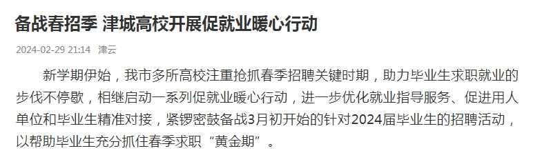 新学期伊始,我市多所高校注重抢抓春季招聘关键时期,助力毕业生求职就业的步伐不停歇,相继启动一系列促就业暖心行动,进一步优化就业指导服务、促进用人单位和毕业生精准对接,紧锣密鼓备战3月初开始的针对2024届毕业生的招聘活动,以帮助毕业生充分抓住春季求职“黄金期”。