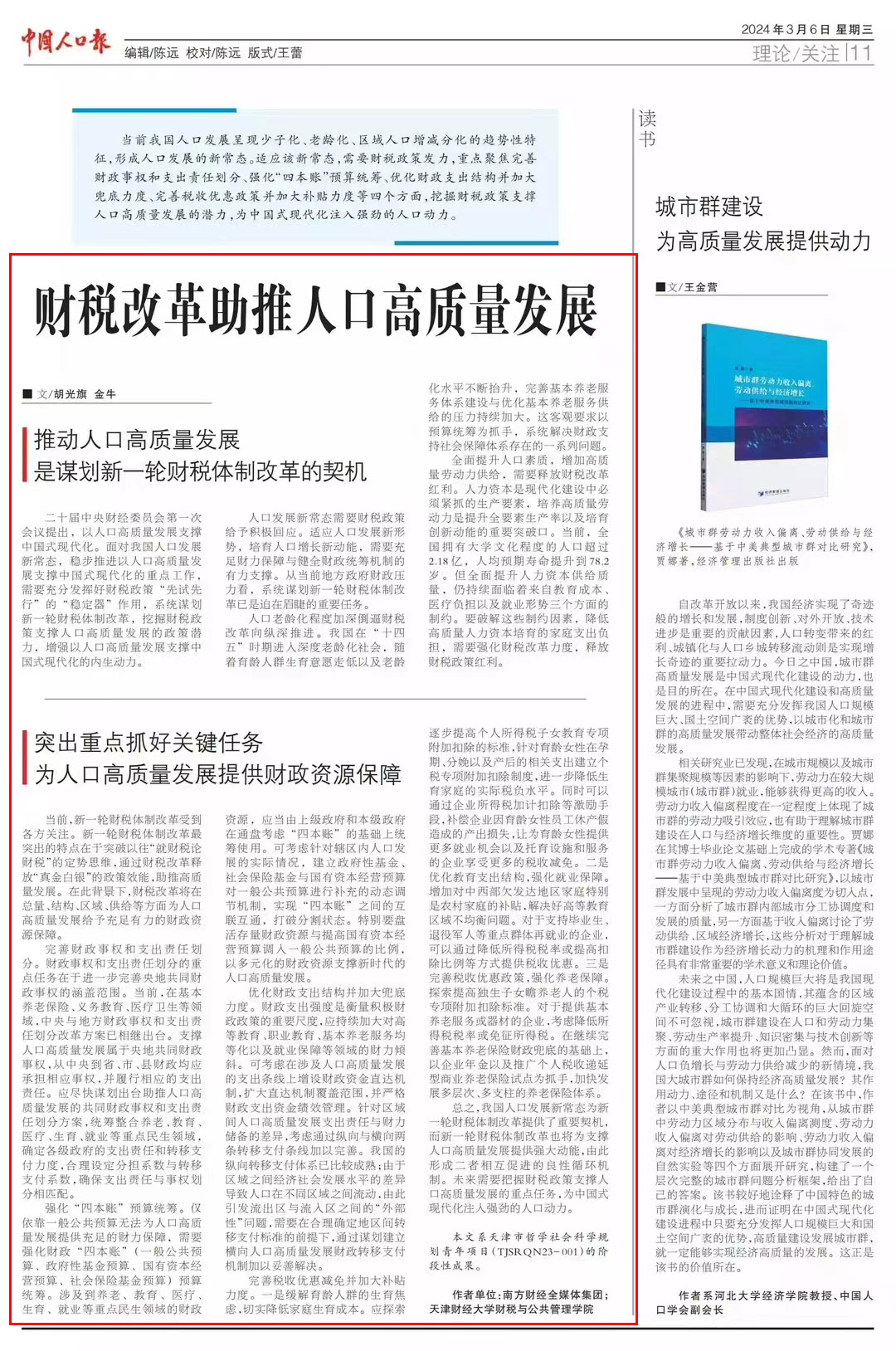 《中国人口报》刊发我校财税与公共管理学院教师金牛文章:财税改革助推人口高质量发展