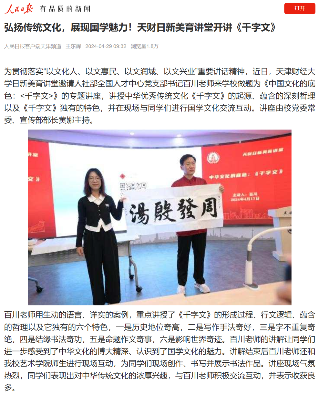 《人民日报》客户端报道我校日新美育讲堂邀请人社部全国人才中心党支部书记百川老师来学校做题为《中国文化的底色:<千字文>》的专题讲座,并与同学们进行国学文化交流互动。