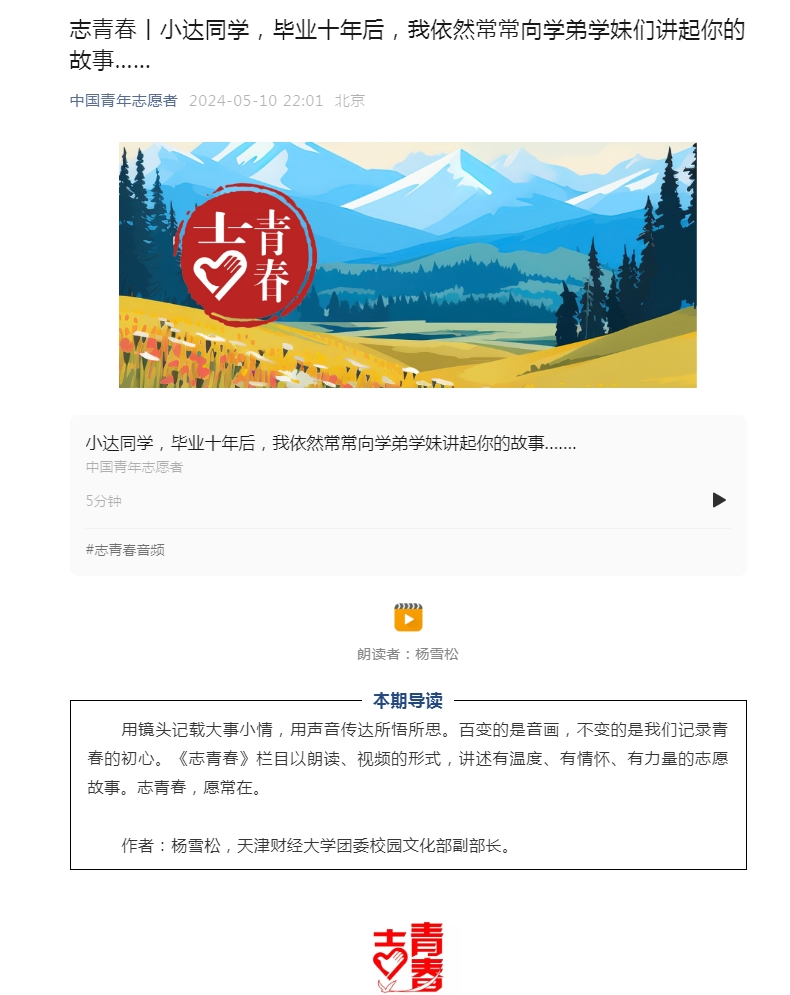 《中国青年志愿者》官微刊发我校团委干部杨雪松写给西部计划志愿者的一封信