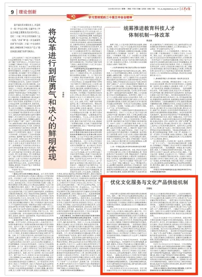 《天津日报》刊发我校马克思主义学院教师王勤瑶理论文章:优化文化服务与文化产品供给机制