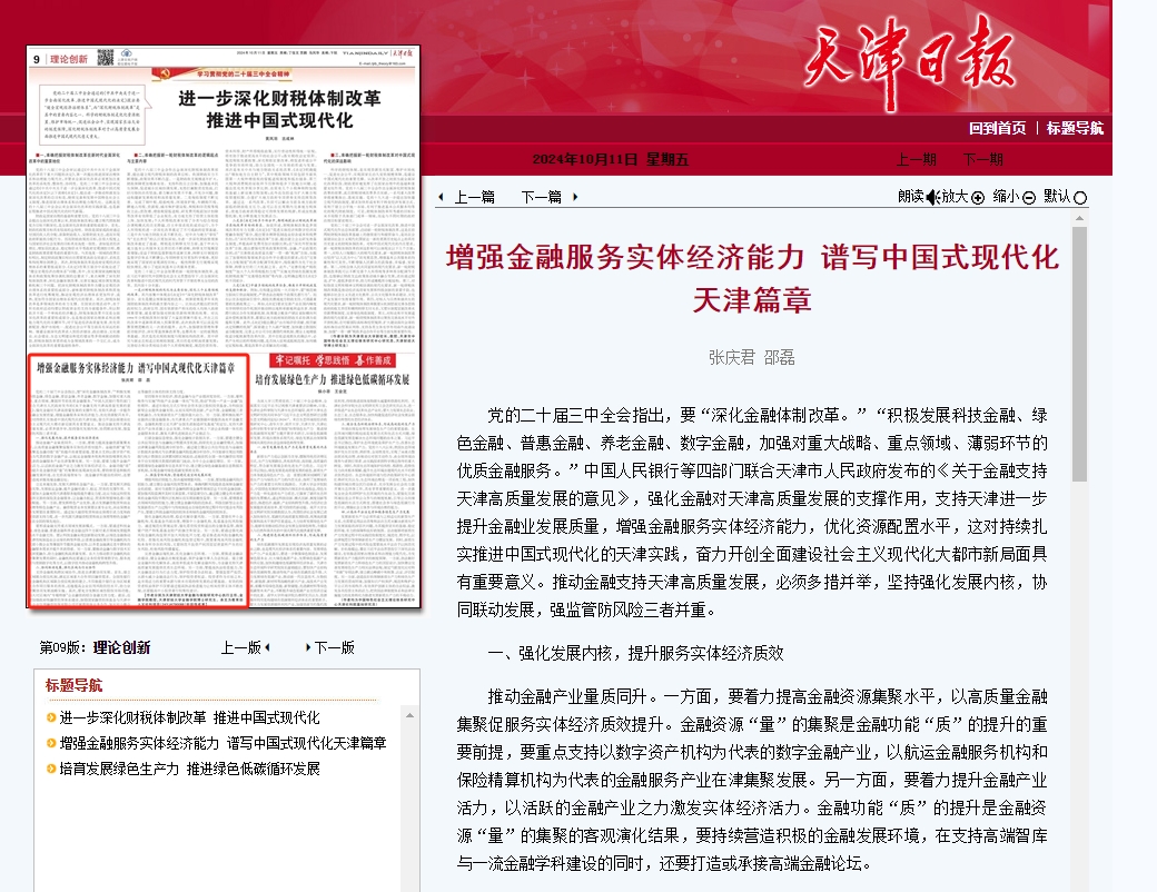 党的二十届三中全会指出,要“深化金融体制改革。”“积极发展科技金融、绿色金融、普惠金融、养老金融、数字金融,加强对重大战略、重点领域、薄弱环节的优质金融服务。”中国人民银行等四部门联合天津市人民政府发布的《关于金融支持天津高质量发展的意见》,强化金融对天津高质量发展的支撑作用,支持天津进一步提升金融业发展质量,增强金融服务实体经济能力,优化资源配置水平,这对持续扎实推进中国式现代化的天津实践,奋力开创全面建设社会主义现代化大都市新局面具有重要意义。推动金融支持天津高质量发展,必须多措并举,坚持强化发展内核,协同联动发展,强监管防风险三者并重。