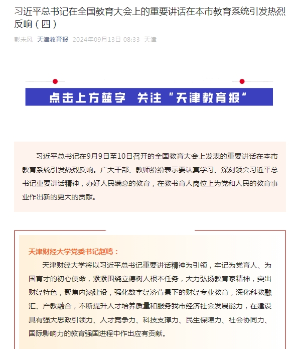 《天津教育报》报道习近平总书记在全国教育大会上的重要讲话在我校引发热烈反响