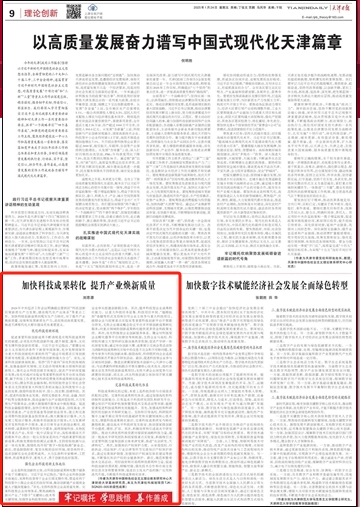 2024年中央经济工作会议明确提出要抓好“科技创新引领新质生产力发展,建设现代化产业体系”等重点工作。加快科技创新成果向现实生产力转化,对于提升产业焕新质量、培育和发展新质生产力,进而推动高质量发展、推进天津现代化大都市建设具有重要意义。