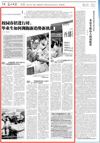 当前,大学生就业面临怎样的新趋势?为实现高质量充分就业,还要破解哪些难题,又有哪些途径可以开拓、哪些举措应该强化?为深度剖析这些问题,本版推出“2025高校毕业生就业新观察”系列报道,通过记者的调研采访,分别从新趋势、新课程、新愿望等方面入手,探索大学生高质量就业之策,并邀请专家学者与一线工作者积极建言、共同助力。