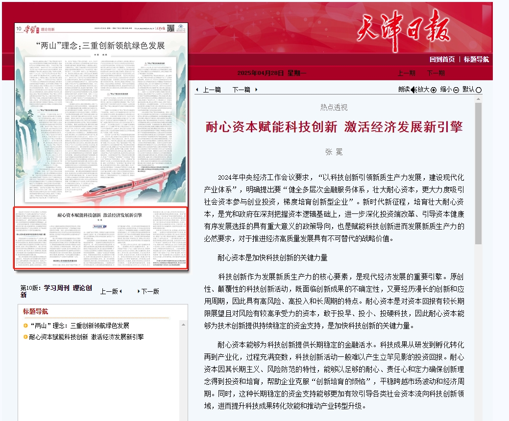 2024年中央经济工作会议要求,“以科技创新引领新质生产力发展,建设现代化产业体系”,明确提出要“健全多层次金融服务体系,壮大耐心资本,更大力度吸引社会资本参与创业投资,梯度培育创新型企业”。新时代新征程,培育壮大耐心资本,是党和政府在深刻把握资本逻辑基础上,进一步深化投资端改革、引导资本健康有序发展选择的具有重大意义的政策导向,也是赋能科技创新进而发展新质生产力的必然要求,对于推进经济高质量发展具有不可替代的战略价值。