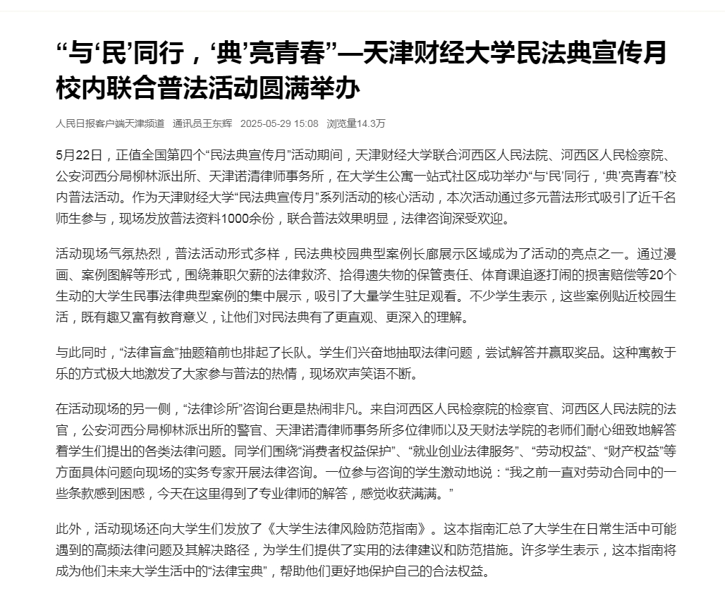 《人民日报》客户端:“与‘民’同行,‘典’亮青春”—天津财经大学民法典宣传月校内联合普法活动圆满举办