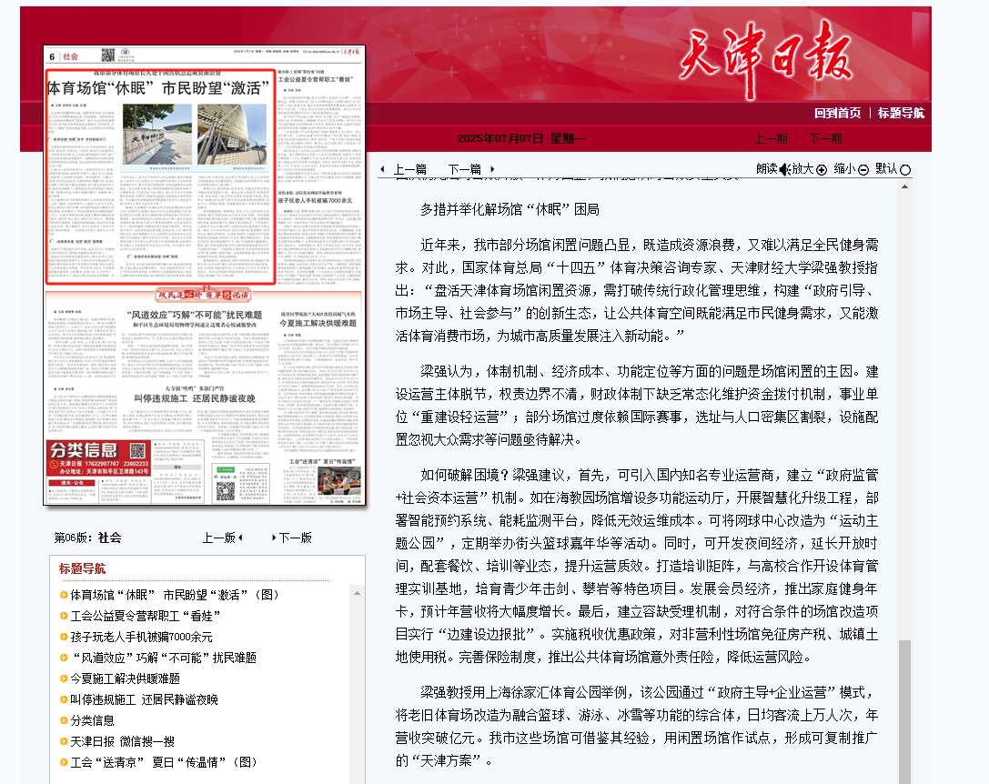 《天津日报》记者采访商学院教授梁强:体育场馆“休眠” 市民盼望“激活”
