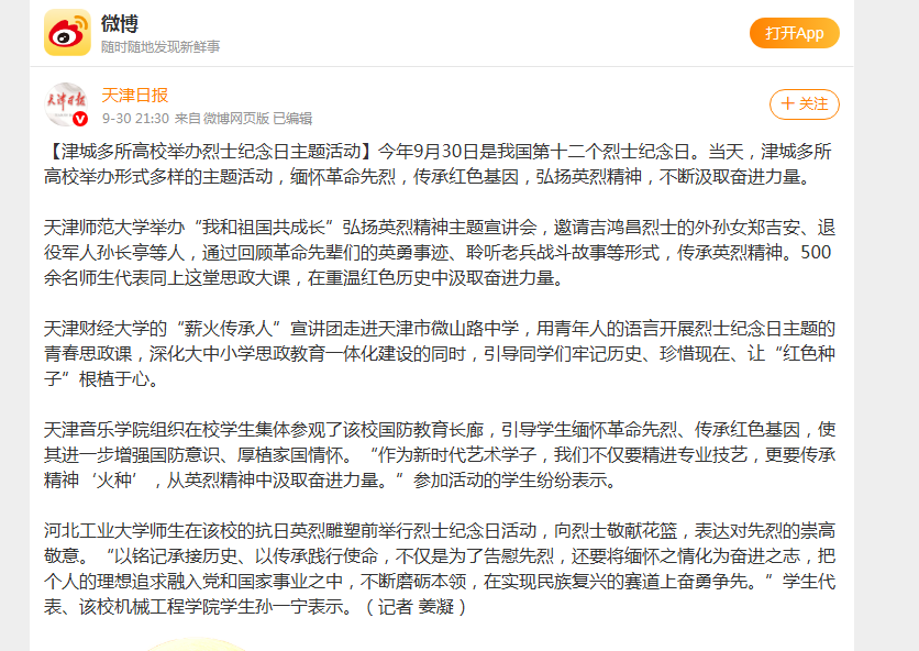 《天津日报》微博报道我校举办烈士纪念日主题活动