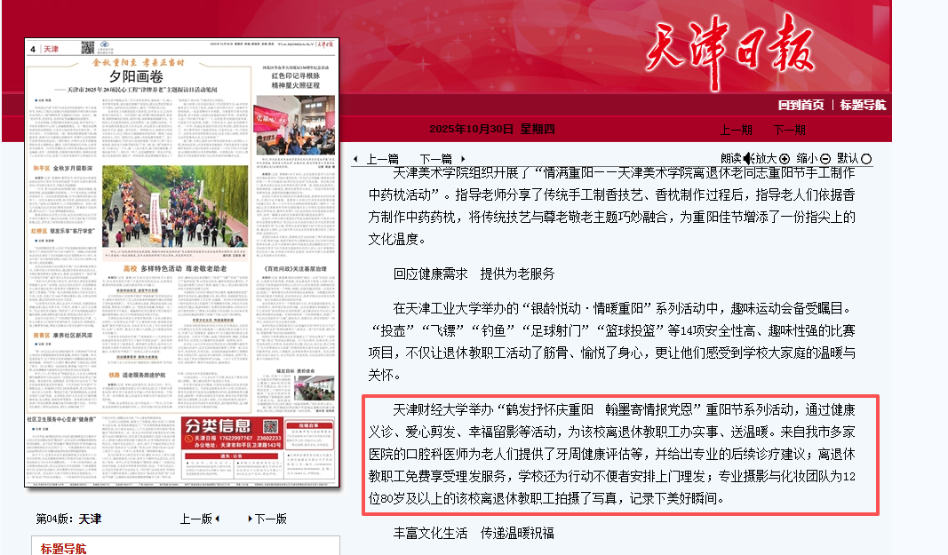 天津日报报道我校开展丰富多彩重阳节活动