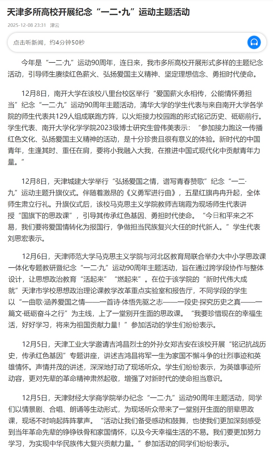12月8日,南开大学在该校八里台校区举行“爱国薪火永相传,公能情怀勇担当”纪念“一二·九”运动90周年主题活动,清华大学的学生代表与来自南开大学各学院的师生代表共129人组成联跑方阵,以火炬接力校园跑的形式铭记历史、砥砺前行。学生代表、南开大学化学学院2023级博士研究生曾伟美表示:“参加接力跑这一传播红色文化、弘扬爱国主义精神的活动,是十分珍贵且很有意义的体验。新时代的中国青年,生逢其时、重任在肩,要将小我融入大我,在推进中国式现代化中贡献青年力量。”
