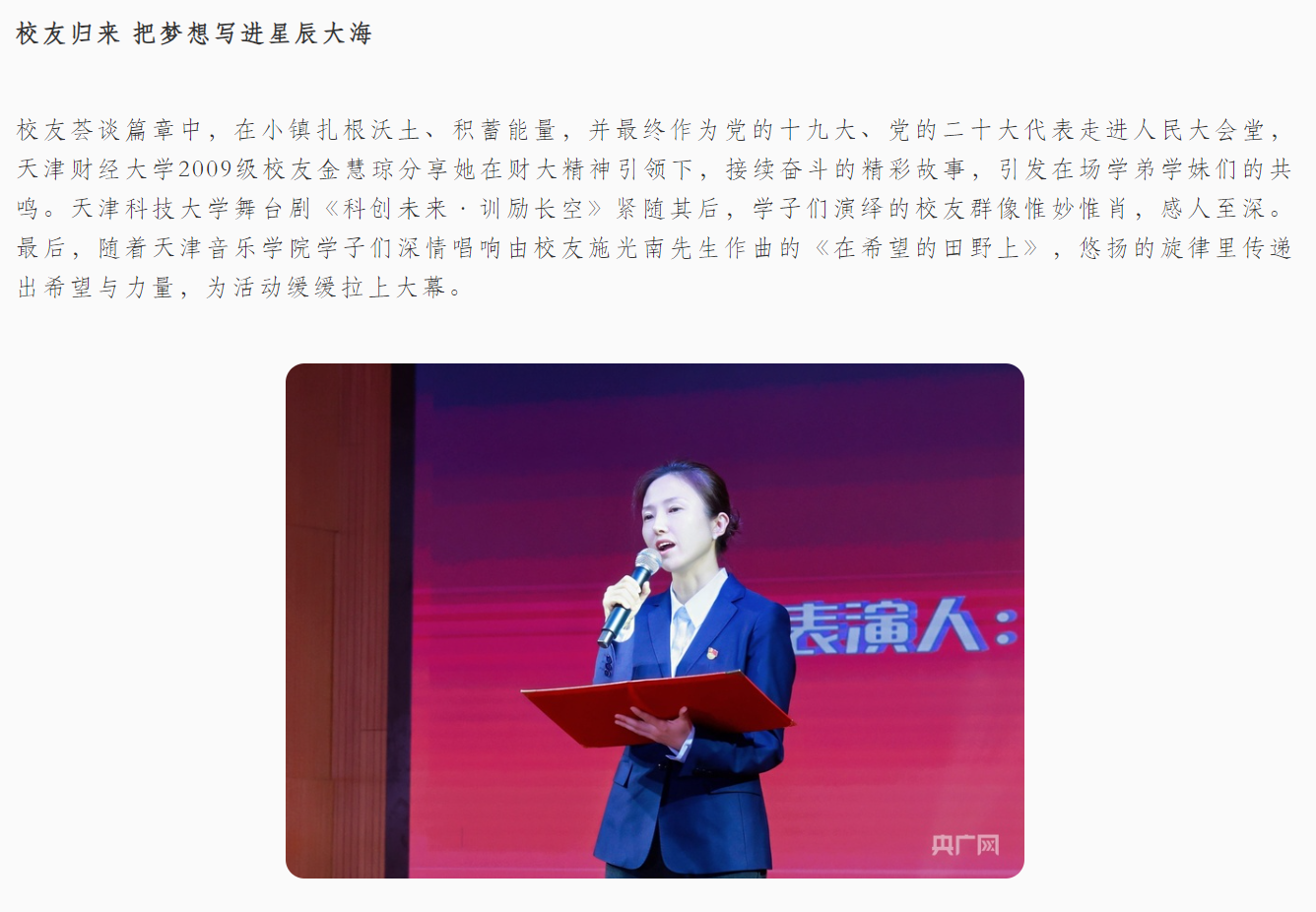 校友荟谈篇章中,在小镇扎根沃土、积蓄能量,并最终作为党的十九大、党的二十大代表走进人民大会堂,天津财经大学2009级校友金慧琼分享她在财大精神引领下,接续奋斗的精彩故事,引发在场学弟学妹们的共鸣。天津科技大学舞台剧《科创未来·训励长空》紧随其后,学子们演绎的校友群像惟妙惟肖,感人至深。最后,随着天津音乐学院学子们深情唱响由校友施光南先生作曲的《在希望的田野上》,悠扬的旋律里传递出希望与力量,为活动缓缓拉上大幕。