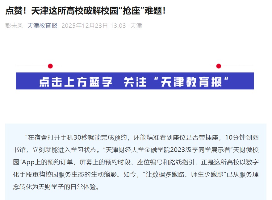 “在宿舍打开手机30秒就能完成预约,还能精准看到座位是否带插座,10分钟到图书馆,立刻就能进入学习状态。”天津财经大学金融学院2023级李同学展示着“天财微校园”App上的预约订单,屏幕上的预约时段、座位编号和路线指引,正是这所高校以数字化手段重构校园服务生态的生动缩影。如今,“让数据多跑路、师生少跑腿”已从服务理念转化为天财学子的日常体验。