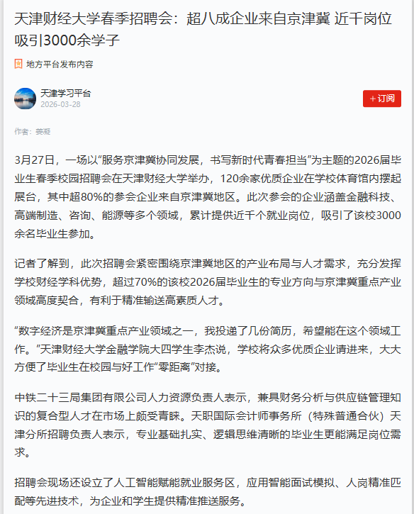 昨日,一场以“服务京津冀协同发展,书写新时代青春担当”为主题的2026届毕业生春季校园招聘会在天津财经大学举办,120余家优质企业在学校体育馆内摆起展台,其中超80%的参会企业来自京津冀地区。此次参会的企业涵盖金融科技、高端制造、咨询、能源等多个领域,累计提供近千个就业岗位,吸引了该校3000余名毕业生参加。