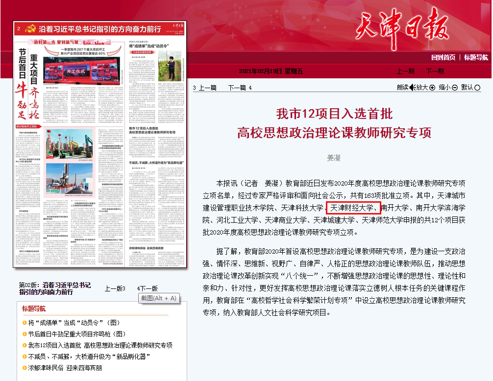 《天津日报》报道我校入选首批高校思想政治理论课教师研究专项