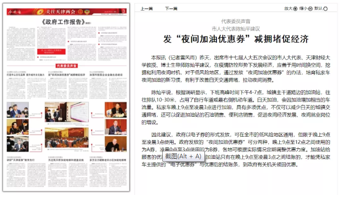 天津市政协十四届四次会议、天津市十七届人大五次会议分别于1月24日上午、1月25日上午开幕。我校参加天津市“两会”的9位代表委员认真履职,踊跃发言,在充分肯定政府工作报告的同时,积极围绕保就业、保民生、科技创新、高质量发展等话题,献计献策。《天津新闻》《今晚报》等媒体报道了天财代表委员的声音。