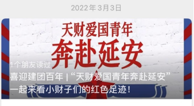 2022年,正值喜迎党的二十大和庆祝建团百年之际,天津财经大学团委为了鼓励新时代的青年牢牢谨记习近平总书记的嘱托,敢于有梦、勇于追梦、勤于圆梦,用实际行动践行“请党放心,强国有我”的铮铮誓言,于2022年1月1日推出“天财爱国青年奔赴延安”线上体验活动,旨在通过学习和运动两种形式,使体验者感受当年进步青年冲破重重阻挠奔赴延安的无畏精神!