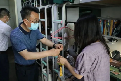 根根丝线连,切切情谊深。校领导与老师们来到学生宿舍,为在校的千余名“小财子”们送去香囊与粽子,叮嘱大家做好个人防护,调整心态和节奏并借香囊的寓意祝愿大家学业顺利,端午安康。