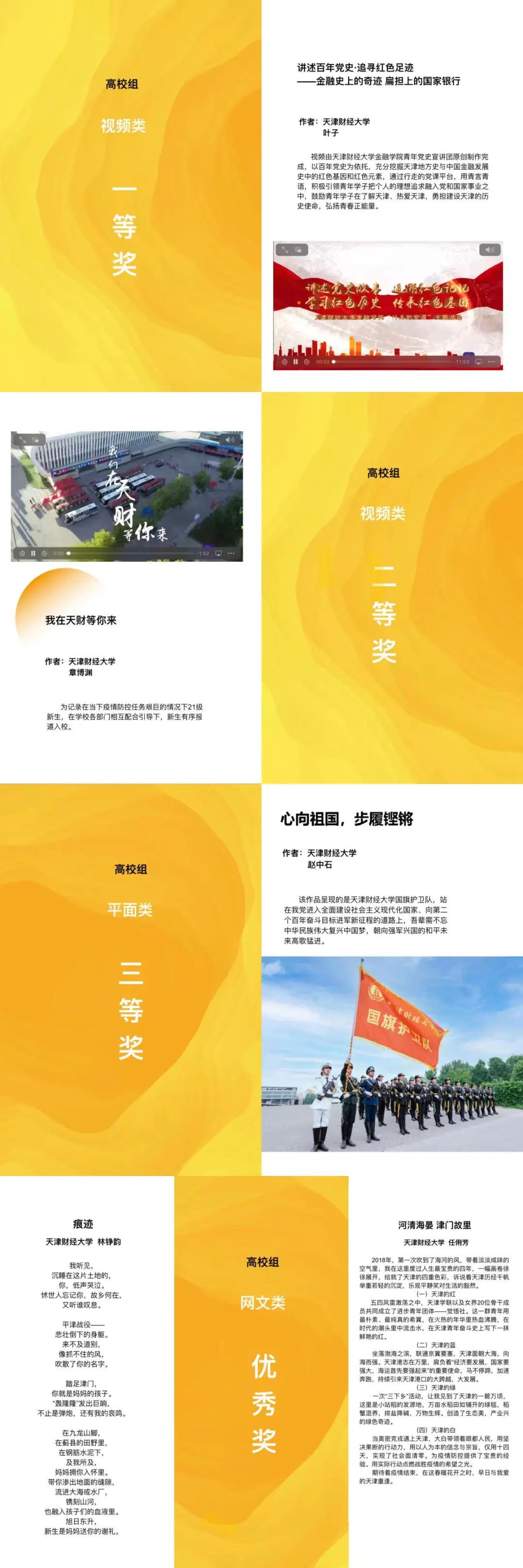我校高度重视本次大赛,自2021年12月正式启动以来,同学们踊跃参加比赛,彰显出大学生青春昂扬的精神风貌。经过市级复审、专家评审,叶子同学(金融学院 金融1901)的作品《讲述百年党史•追寻红色足迹—金融史上的奇迹扁担上的国家银行》获得高校组视频类一等奖,章博渊同学(艺术学院 产品1801)的作品《我在天财等你来》获得高校组视频类二等奖,赵中石同学(经济学院 国商2001)的作品《心向祖国 步履铿锵》获得高校组平面类三等奖,林铮韵同学(法学院 法学2002)的作品《痕迹》和任俐芳同学(理工学院 数学1801)的作品《河清海晏 津门故里》获得高校组网文类优秀奖。