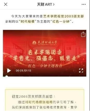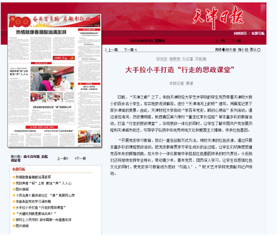 大学生党员带着财大附小的百余名小学生,通过游览海河、历史博物馆,到西青区第六埠村“重走红军长征路”等丰富多彩的教育活动,大手拉小手打造“行走的思政课堂”,就是在这样边听、边看、边记、边画的过程中,通过一个个革命故事、一件件历史文物让学生了解中国共产党发展历程和天津城市变迁,引导学子发扬红色传统,弘扬中华优秀传统文化和爱国主义精神。不少艺术学院学生发朋友圈赞叹能将自己的专业和党史学习结合起来感觉获得感满满,《天津日报》等媒体活动进行了报道。