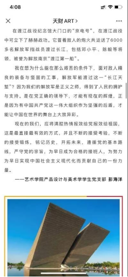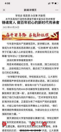 党史学习活动伊始,财大艺术学院充分利用寒假,组织学生走进家乡红色教育基地,号召广大青年学子从百年历程中传承红色基因,以“传承红色足迹·讲好党史故事”主题实践活动为依托,将周恩来邓颖超纪念馆、李大钊故居、渡江战役纪念馆等作为学习党史的红色课堂,亲身感受党的历史,活动被《今晚报》报道。学生们参加活动后均坚定表示,要坚定理想信念,筑牢初心使命,听党话、感党恩、跟党走。