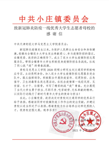 近日,马克思主义学院收到一封来自盐山县小庄镇所写的感谢信,对刘文通同学在小庄镇疫情防控志愿服务中主动扛起青春战旗的实际行动,以及勇于担当、尽职尽责、吃苦耐劳、无私奉献的精神给予高度地肯定与表扬。