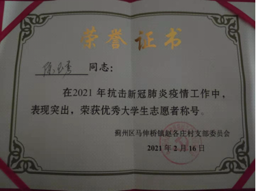 2021年初随着河北省疫情加剧,河北省沧州市大浪淀乡加强了疫情防控工作。叶新晨同学第一时间响应号召,报名参加了志愿者队伍,想要尽自己所能为家乡疫情防控工作出一份力。根据村委会的安排,叶新晨同学负责出入口的疫情防控检查工作,每天从8点开始在寒风中守在村口阻止外来人员进入和村内人员外出;宣传疫情防控的重要性;对返乡人员进行排查,挨家挨户去排查情况,检查返乡人员的核酸检测报告等相关证件是否齐全,连续14天去为他们测量体温;配合医务人员为全村人员做核酸检测,统计人员名单,并带领医务人员为村内行动不便的老年人入户检测。通过这次志愿服务,叶新晨同学深刻地感受到当代青年身上该有的责任与担当。有千千万万志愿者在后方各个场所勤勤恳恳地付出着,有千千万万人民群众的默默支持和配合,相信这场新型冠状病毒的遭遇战,我们一定能够取得最终的胜利。