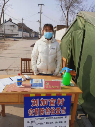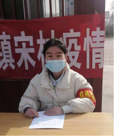 1月中旬,宋雅欣同学自告奋勇,向当地的村委会提出申请,加入到防控疫情大学生志愿者行列。宋村在进出村庄的四个路口,安置了四处疫情值班工作棚,志愿者们的主要工作是在工作棚外面核查来往人员的健康码、测量体温并且详细登记在专用的表格上。志愿服务期间,寒冷的空气使她的手脚冻的冰凉,但她从未放松过对工作的认真,始终高效的完成任务,没有一句抱怨,却感到无比自豪。