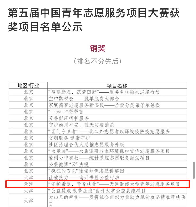 第五届中国青年志愿服务项目大赛全国赛终评于11月22日至24日在广东东莞举办。1000个全国赛终评的入围项目,通过项目团队线上路演答辩、评委监委线下集中评审的方式进行了评审和交流。本次天津市共有32支队伍进入国赛终评阶段,经评审,我校青年志愿服务项目“守护希望·青春扶贫”获得全国铜奖。
