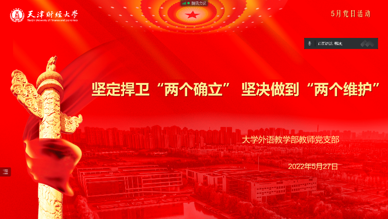 5月27日,按照“迎盛会、铸忠诚、强担当、创业绩”主题学习宣传教育实践活动工作安排,人文学院大学外语教学部教师党支部围绕“坚定捍卫‘两个确立’,坚决做到‘两个维护’”专题,通过主题党日、“政治生日”和“课程思政教学案例分享会”等多种形式,开展了专题学习研讨实践活动。