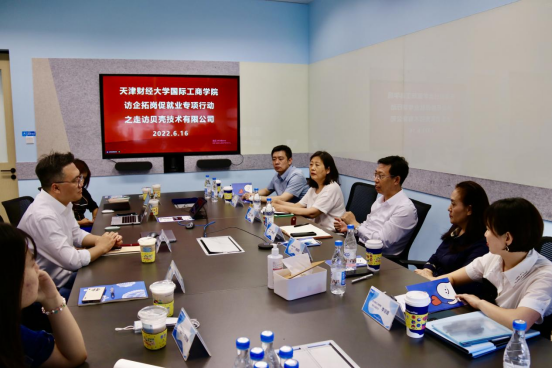 2022年6月16日下午,天津财经大学副校长韩少波带队前往贝壳技术有限公司走访调研,国际工商学院领导及管理干部代表陪同走访。贝壳技术有限公司财务总监黄文胥,人事经理孙玮,财务高级经理杨明霞、邢维佳等参加座谈。双方就“校企合作育人才”开展交流,并签署战略合作协议。