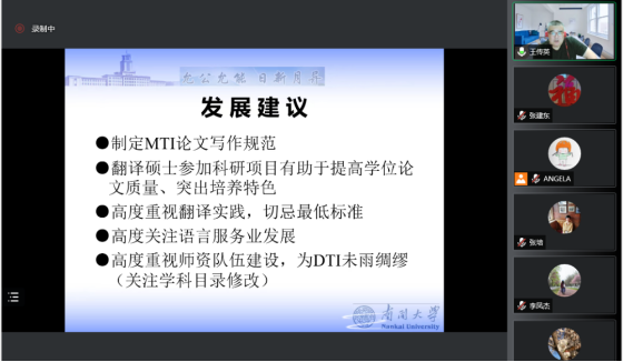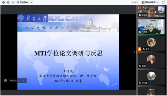 6月6日,人文学院MTI中心邀请全国翻译教指委委员、南开大学博士生导师王传英教授为研究生导师做了题为“MTI学位论文调研与反思”线上师资培训。本次师资培训由人文学院副院长张建东主持,人文学院外语学科全体硕士生导师及部 分青年教师代表参加了培训。
