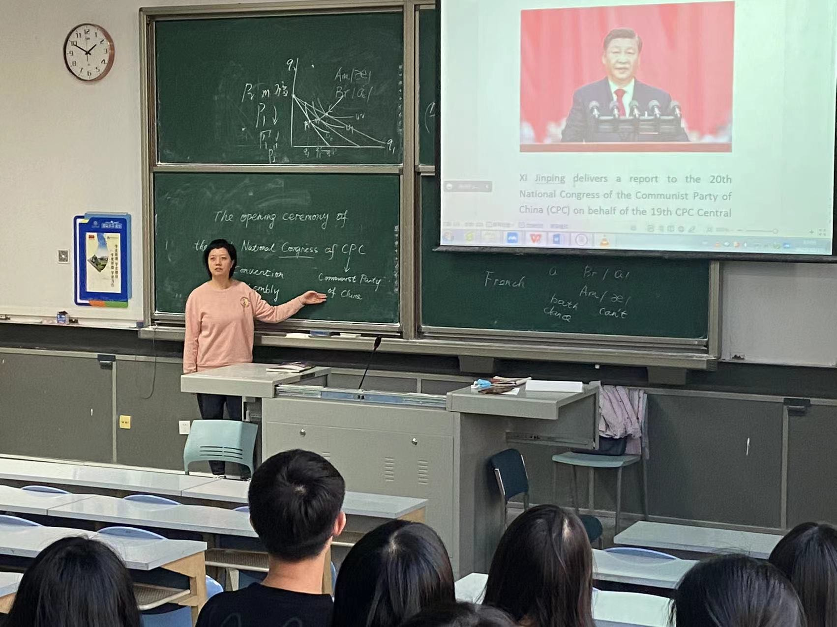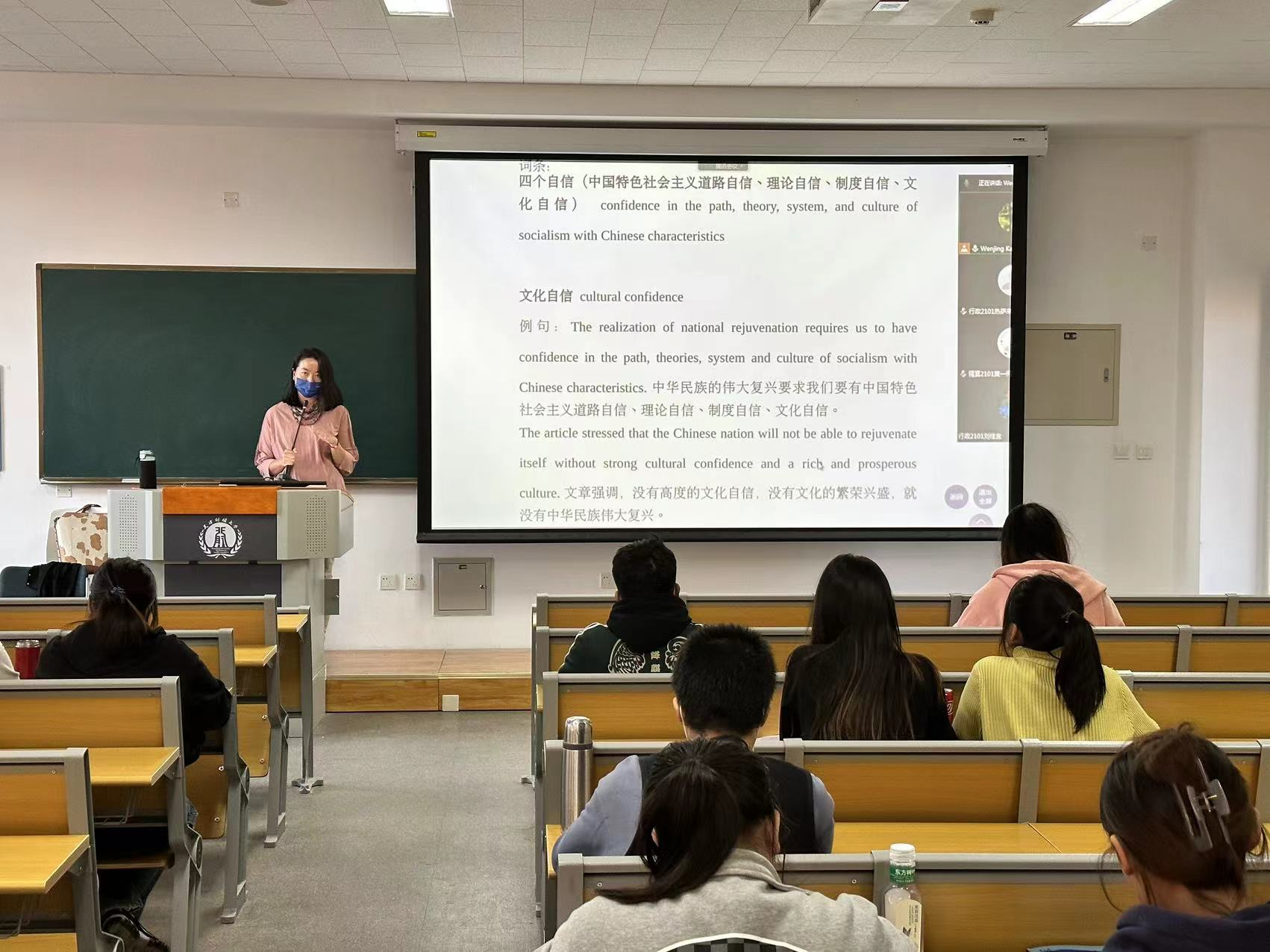 10月17日的大学英语课堂上,老师们将二十大精神融入教学当中,在语言教学的同时从坚定学生理想信念、厚植爱国主义情怀、加强品德修养等方面潜移默化地提升学生综合素质。王天睿老师将二十大相关术语、重要概念的英文表述作为新闻热点内容,解释了二十大的重要性以及如何用英语来介绍此次盛会;张梦佳老师结合课文中“priority”、“emulate”、“accomplish”等词在“着力稳定市场主体保就业”、“见贤思齐”、“不忘初心,方得始终”等句子中的应用,强化了学生用英语讲中国故事的能力,也将国家发展和传统文化等内容带入课堂;康雯靖老师在主题为BeatYourFear这一单元,以 “四个自信”为主题组织课前讨论,引导学生理解在中国共产党的领导下,我们能够把亿万人民团结和凝聚起来,一次次跨过急流险滩,一次次战胜困难危机,必然是有坚强有力的领导力量,从而人民才能有信心、有力量。