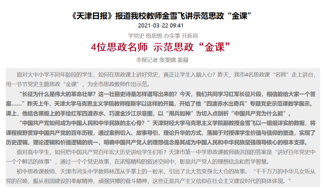 日前,天津市委宣传部公布了《关于表彰基层理论宣讲先进集体、个人和优秀理论宣讲报告、微视频、微信公众号的决定》,其中,我校马克思主义学院副教授金雪飞被评为基层理论宣讲先进个人。金雪飞是我校马克思主义学院副教授,天津市教育系统优秀共产党员,天津市习近平新时代中国特色社会主义思想讲师团成员,河西区“四史”宣讲团专家组成员。先后获首届全国高校思想政治理论课教学展示活动二等奖,天津市第十五届高校青年教师教学竞赛一等奖,天津市高校思政课青年教师教学技能大赛一等奖等各级教学奖项10余项;获2020年天津市高校思政课教师年度影响力人物,天津市普通高校优秀思政课教师等荣誉称号7项;为教育部中青年思政课教师择优资助项目和天津市习近平新时代中国特色社会主义思想示范课主持人。