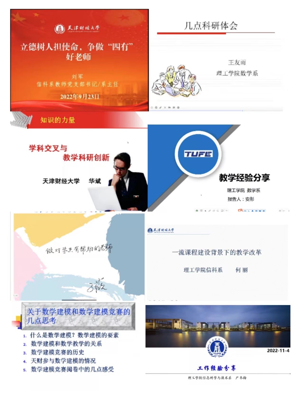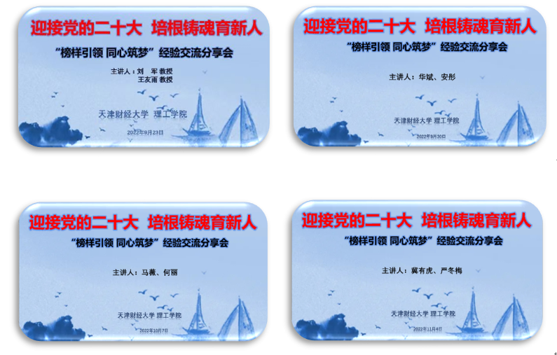 为了迎接党的二十大胜利召开,以及更好的学习宣传贯彻落实党的二十大精神,理工学院通过线上方式分别于9月23日、9月30日、10月7日、11月4日举办了四场“榜样引领 同心筑梦”系列经验交流分享会。我院八位优秀教师代表——刘军、王友雨、华斌、安彤、马薇、何丽、冀有虎、严冬梅分别进行·了专题交流分享,学院全体教职工积极参加。