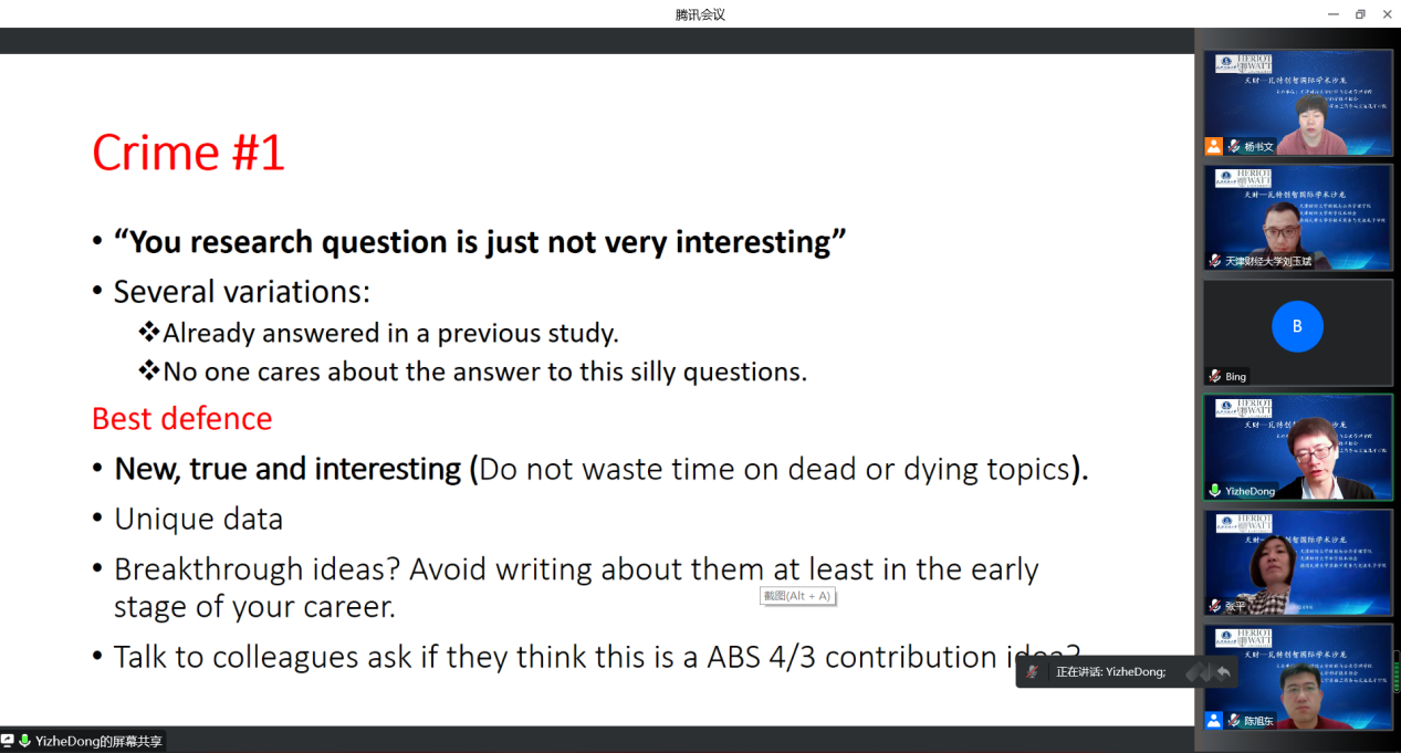董轶哲副教授作了题为《Writing an Article for a Good Refereed Journal》的分享。在讲座正式开始前,对他所担任联合主编的JCEBS(Journal of Chinese Economic and Business Studies)期刊作了简单介绍;接着,就如何写好文章提出几点建议:做好前期准备、有想法要尽快动笔、先粗略写好全文再抠细节等;并分享了作为编辑直接拒稿可能的原因:选择了不合适的期刊、模型方法不恰当、文风和语言存在问题等;指出在审稿过程中文章容易出现的“五宗罪”以及解决方法;我们面对文章被拒和进入复审两种情况时应该怎么做;最后,董轶哲教授列举了中英文文章结构存在的差异以及每一结构的写作要领;指导学生如何选择投稿的期刊和合作对象。之后,师生们就期刊文章的下载、定性文章的发表趋势等问题同董轶哲教授进行了探讨。