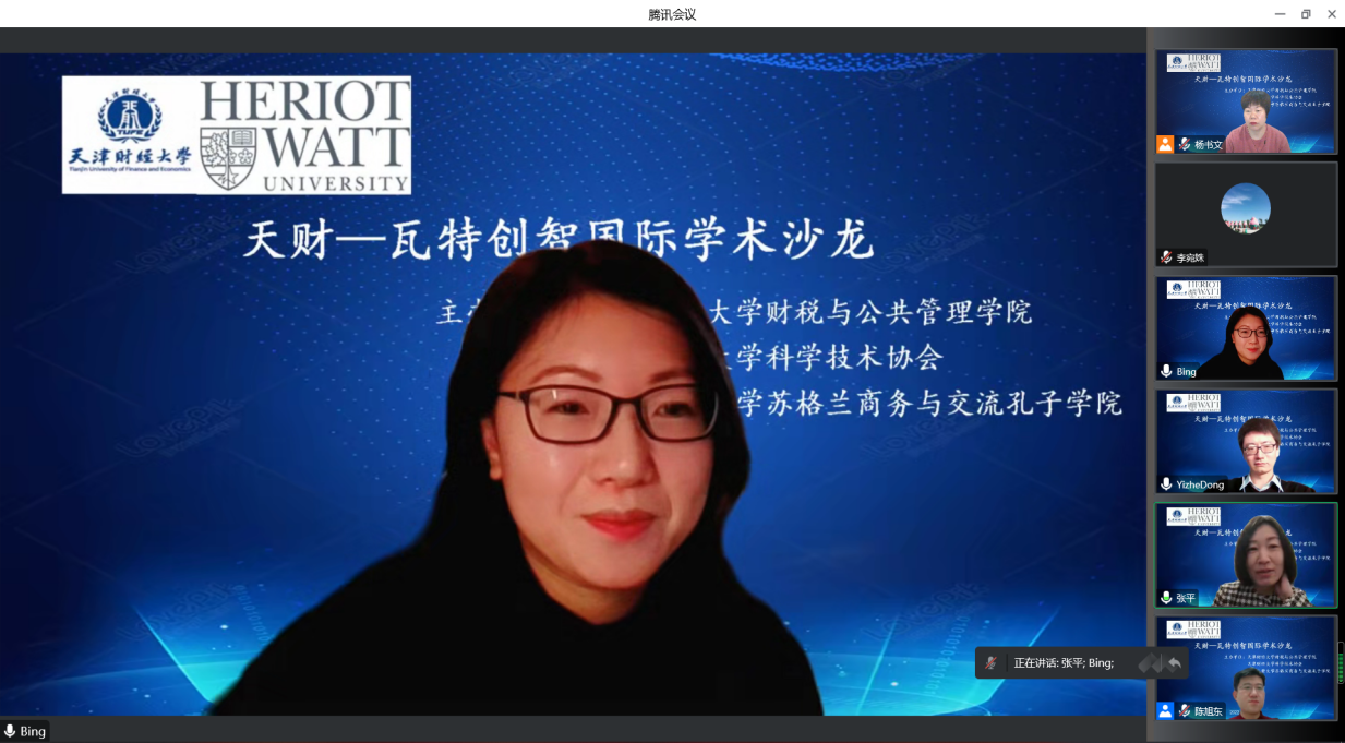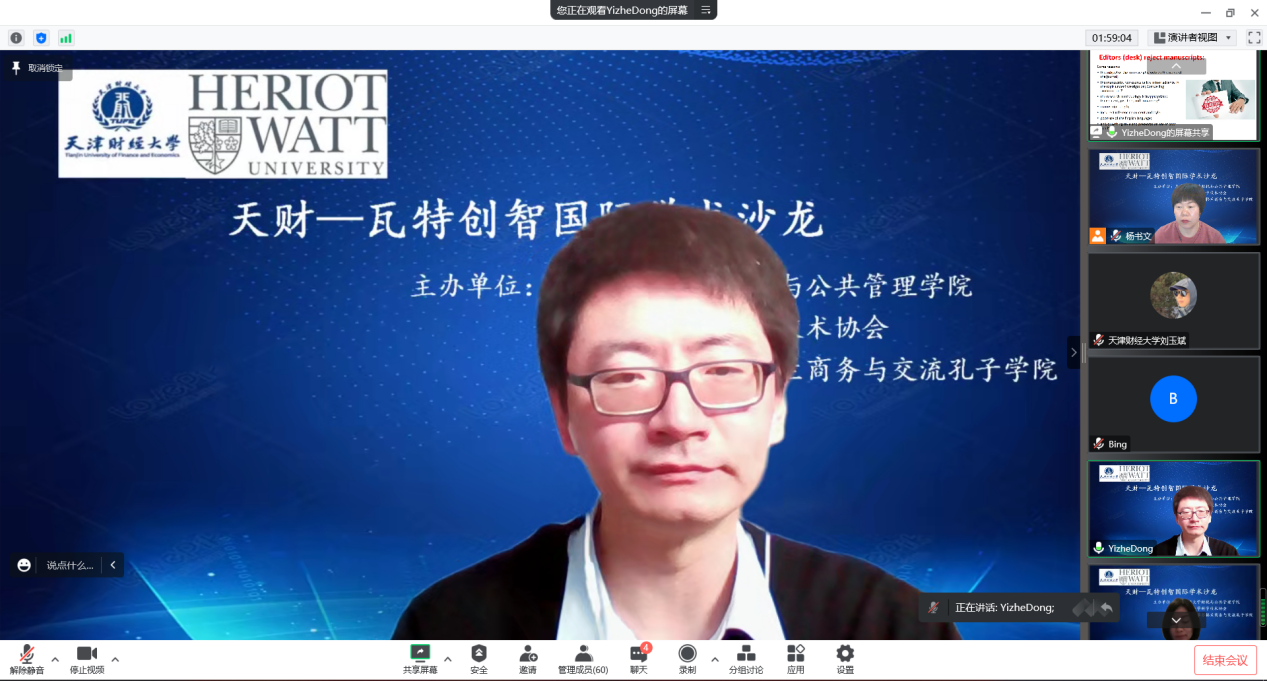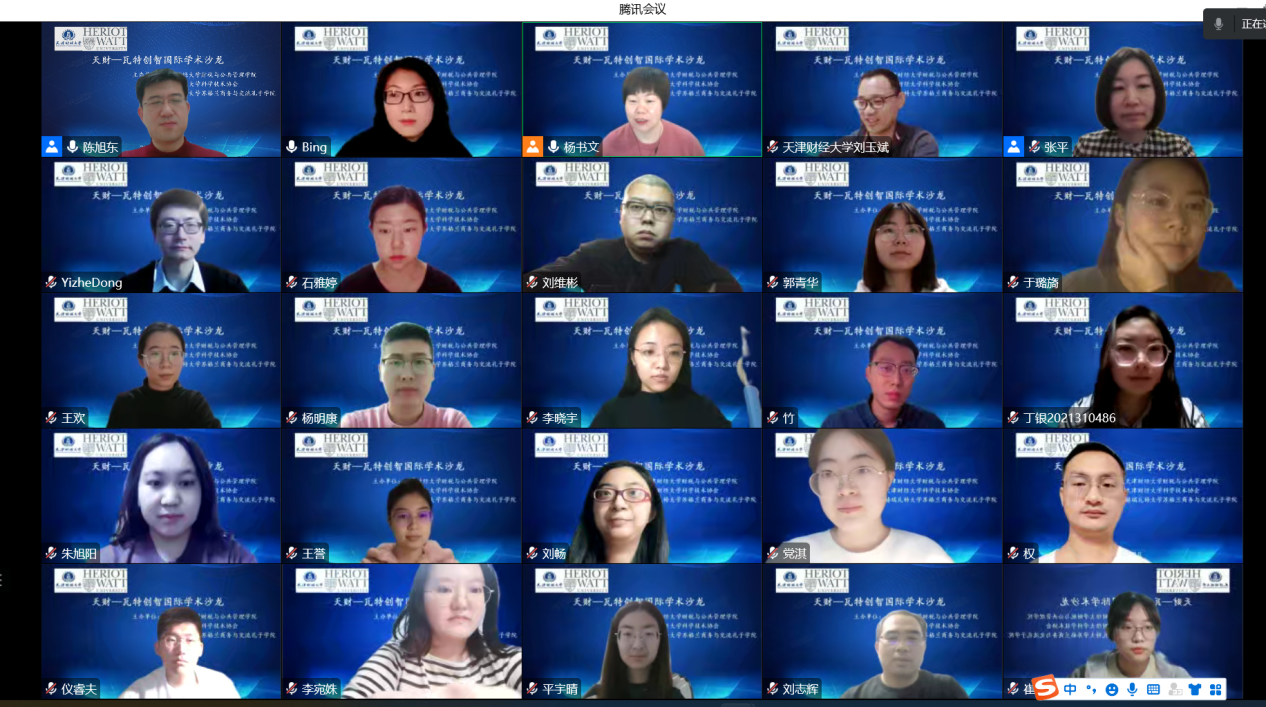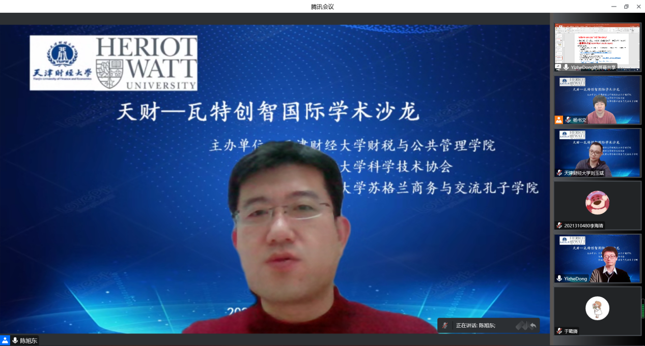 2022年12月9日,由天津财经大学财税与公共管理学院、天津财经大学科学技术协会、赫瑞瓦特大学苏格兰商务与交流孔子学院共同主办的“天财—瓦特创智国际学术沙龙”成功举行。本次沙龙以腾讯会议线上方式进行,由天津财经大学—英国赫瑞瓦特大学苏格兰商务与交流孔子学院中方院长张平教授主持,邀请了英国赫瑞瓦特大学徐冰教授和英国爱丁堡大学董轶哲副教授分别作了精彩的分享,并与师生进行了互动交流。参会的还有天津财经大学财税与公共管理学院陈旭东院长、杨书文副院长、科研处刘玉斌副处长等部分教师和研究生70余人。