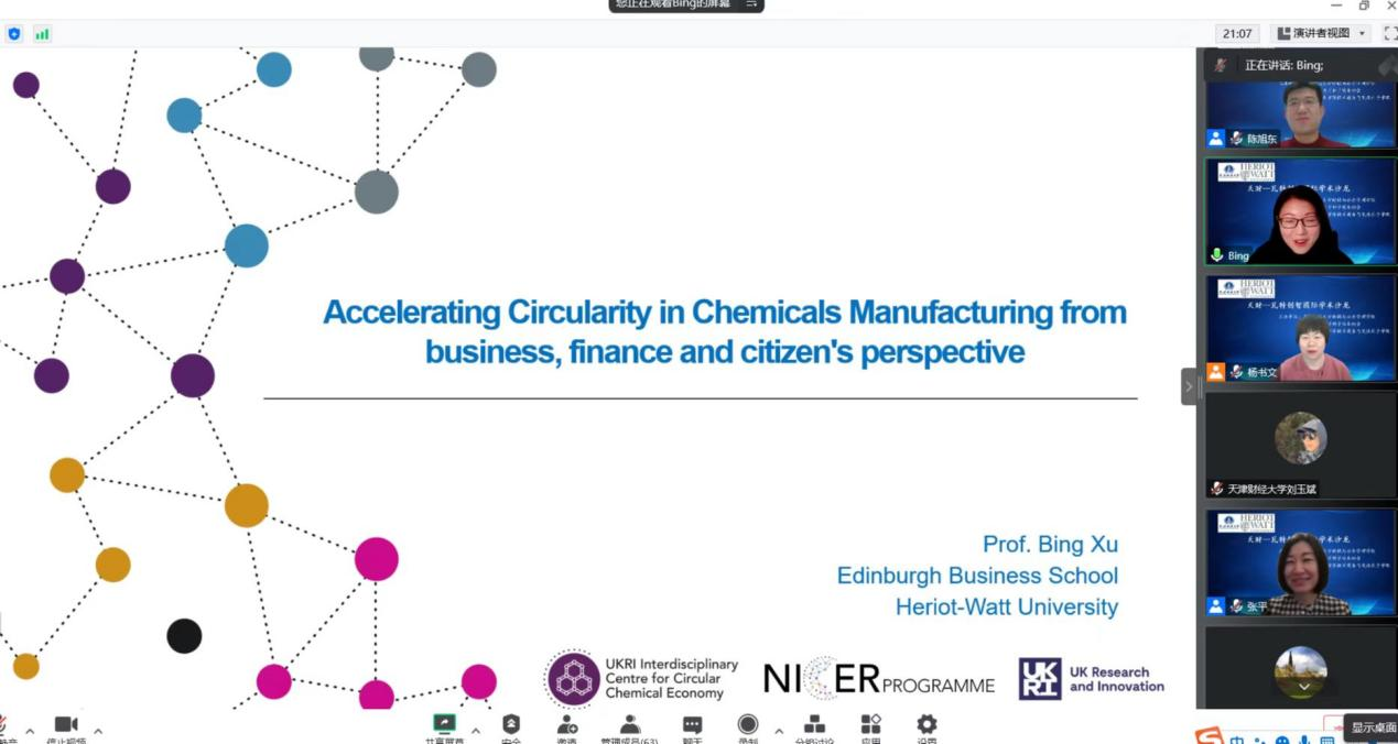 徐冰教授作了题为《Accelerating Circularity in Chemicals Manufacturing from business,finance and citizen’s perspective》的分享,从气候变化带来的风险引入,指出化工行业从线性经济模式转型为循环经济模式对于全球低碳转型、可持续发展具有重要意义;接着徐冰教授向我们介绍了她所在的UKRI循环化工中心的主要研究工作,并以第三个主题“政策、社会和金融”为主,结合具体的案例,从商业模型、金融、公众支持三个角度分析了化工行业要想成功向循环经济过渡与转型所遇到的一些非技术性的障碍与解决方法,并提出了下一步的研究方向与重难点。之后,徐冰教授与参加讲座的师生进行互动,就师生关心的环保税、环境规制等有关问题进行了回答。