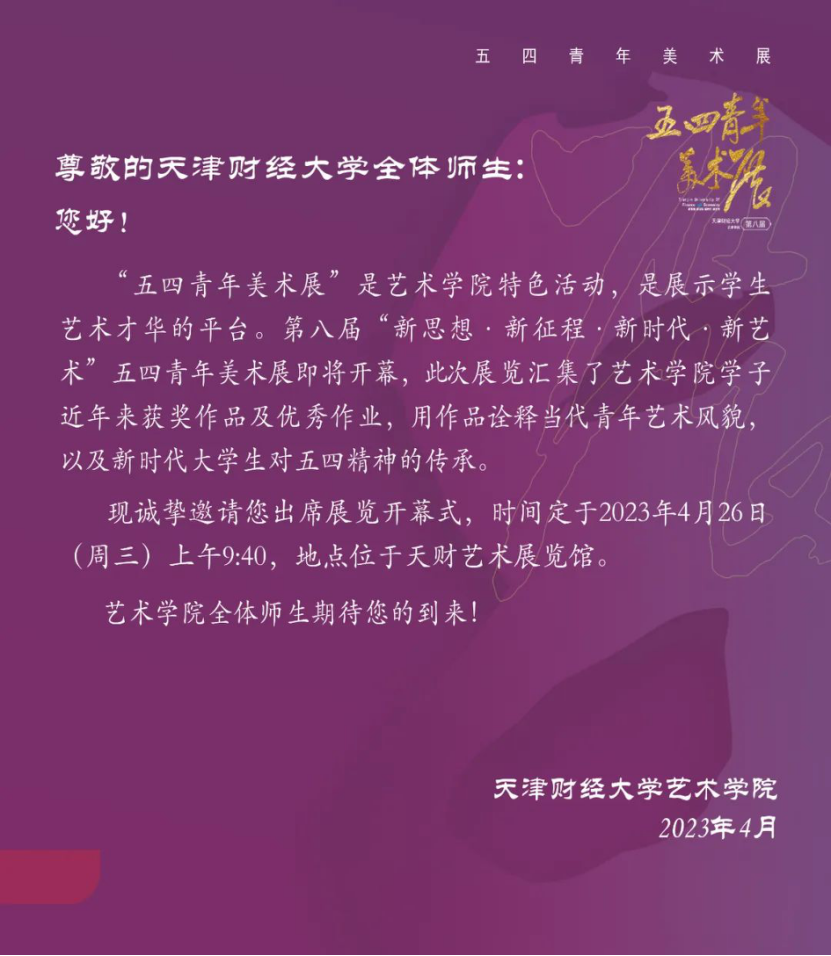 为纪念五四运动104周年,值此五四青年节即将到来之际,现诚挚邀请您出席五四青年美术展开幕式,艺术学院全体师生期待您的到来!