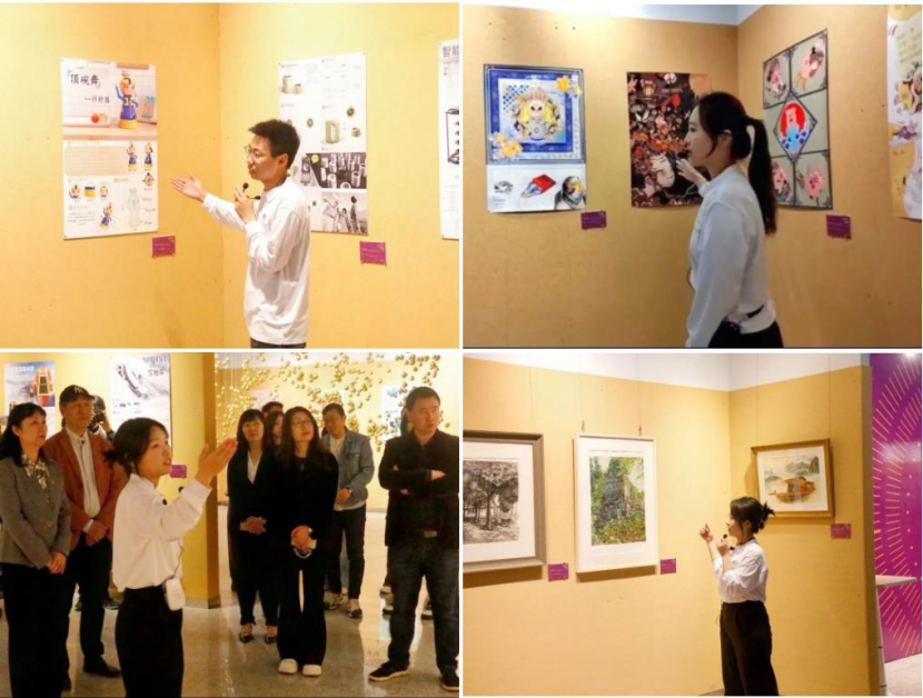 开幕式后,由艺术学院四个专业同学分别为参观展览的领导、老师和来宾进行了展览讲解。此次展览共收到作品200余件,汇集了艺术学院学子众多获奖作品及优秀课程作业,作品分为绘画、海报招贴、环境设计、产品设计几大类,展览内容紧扣新时代,突出展现近年来,祖国日新月异的发展和变化。