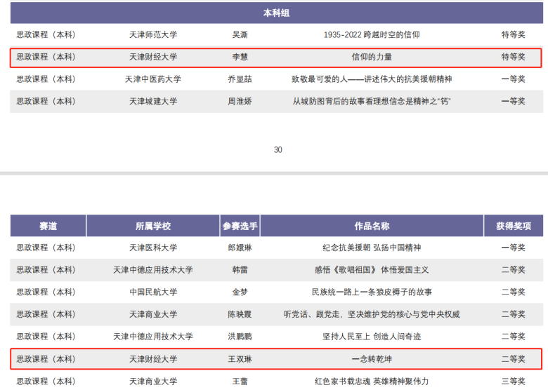 此次“故事思政”微课大赛由市教委、海河教育园区管委会共同举办,旨在贯彻全国高校思想政治工作会议精神,切实推进落实中共中央办公厅、国务院办公厅《关于深化新时代学校思想政治理论课改革创新的若干意见》等文件要求,充分发挥思政课在立德树人、铸魂育人中的关键作用,促进课程思政建设,讲好故事,讲好“大思政课”,通过思政课程和课程思政教学设计,统筹推进大中小学思政一体化建设,提升教学质效。大赛经初审、复赛和决赛,最终评选出思政课程本科组特等奖2名、一等奖3名、二等奖5名、三等奖5名、优秀奖36名,课程思政本科组特等奖2名、一等奖5名、二等奖8名、三等奖10名、优秀奖70名。