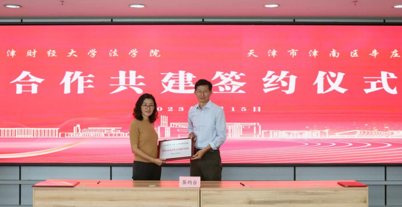 会议进入第二个阶段,陈方书记和朱宏力书记签订了双方党建共建协议。张勤院长向辛庄镇刘海婷副书记、统战委员授予“天津财经大学法学院大学生社会实践及劳动教育基地”牌,田雅志副书记向辛庄镇宋内玲副镇长授予“天津财经大学法学院社区普法宣传工作站”牌。