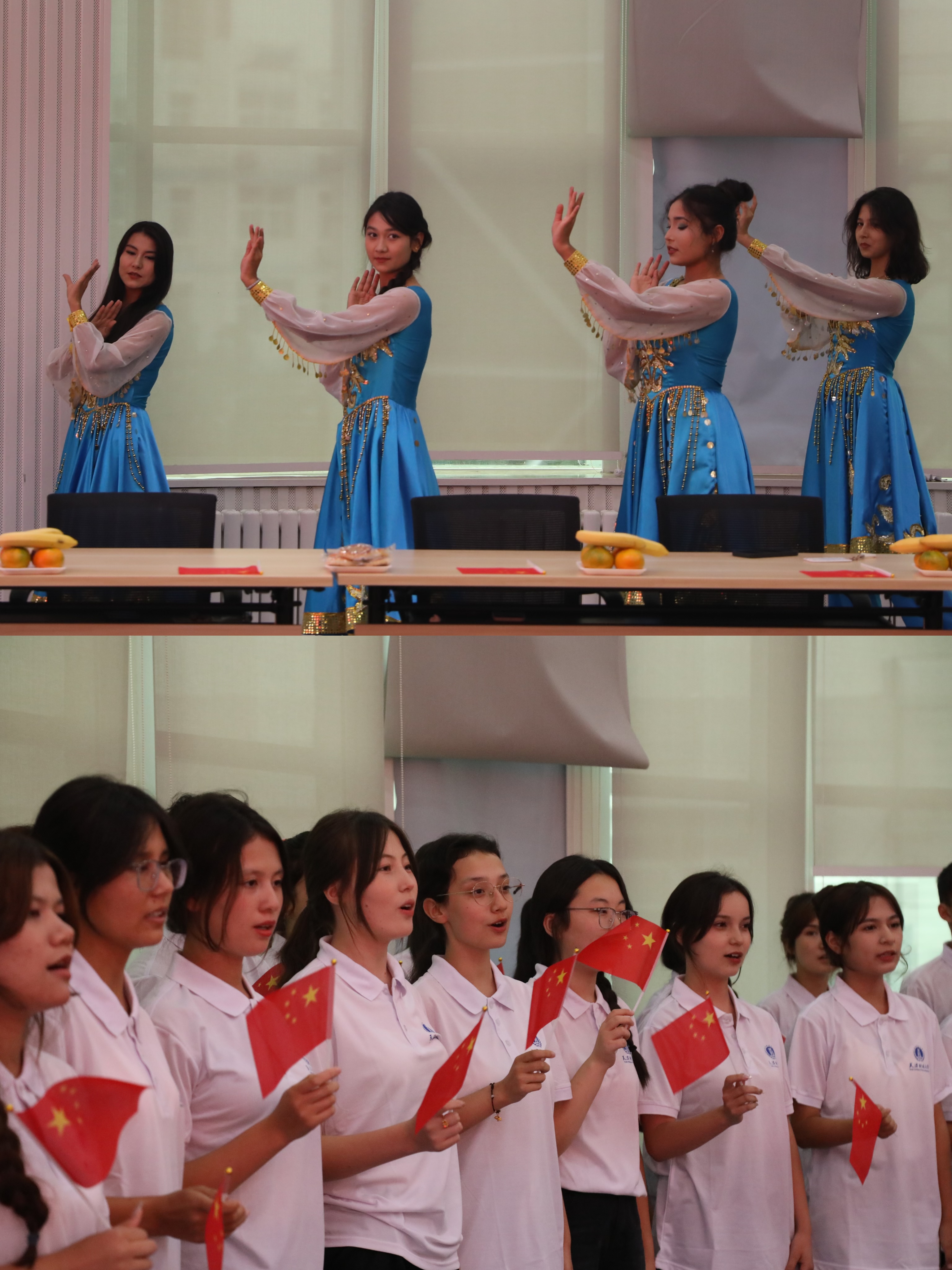 座谈会以少数民族学生表演的歌舞《打起手鼓唱起歌》开场,身着节日盛装的同学们用动听的歌声、欢快的舞蹈展现了新时代青年学生奋发昂扬的精神面貌,表达了对党和国家的无限热爱和真挚祝福。