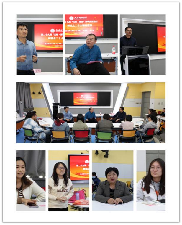 10月20日,在N座录播教室举办了第二十九期“天财·博智”教学发展论坛:师说之“二十大精神进课堂”交流研讨会。本次论坛邀请“党的二十大精神进课程专项”课程负责人:人文学院李然老师、统计学院程郁泰老师做课程教学展示、交流课程建设心得。校工会常务副主席王本锦、党委教师工作部(人事处)副处长樊纪伟、教务处副处长徐志伟以及教师代表参加论坛。